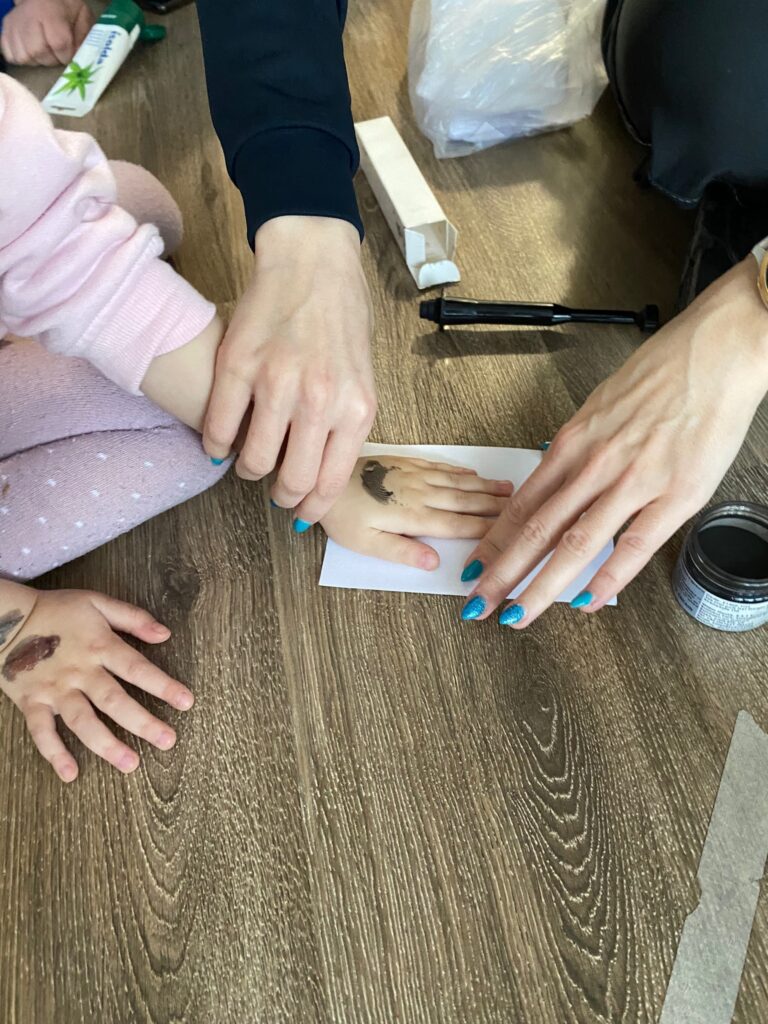 Nakonec přišla nejzábavnější část, snímání otisků prstů. Zjistili jsme jak funguje magnetický prášek a všechny děti nakonec sebraly odvahu a nechaly si ručičku namazat krémem a otisknout na papír. Paní policistka poté nasypala na otisk magnetický prášek a štětečkem jej rozprostřela, zbytek zase sebrala magnetickým štětcem do krabičky.