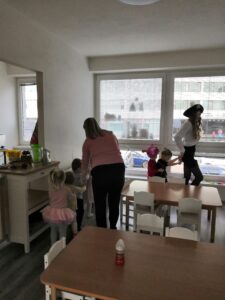 Zlatým hřebem samozřejmě byly karnevaly. Pro některé děti to bylo jejich karnevalové poprvé. Děti měly krásné masky a užili jsme si spoustu tanečních her, hudby, zpěvu, her s míčky, pochoutku v podobě sušeného ovoce a mnoho dalšího.